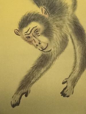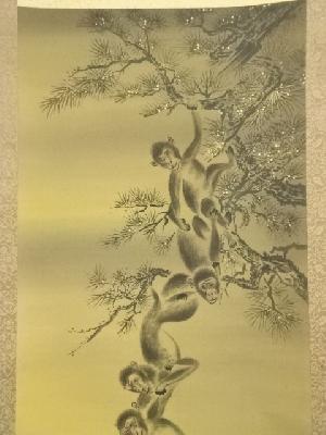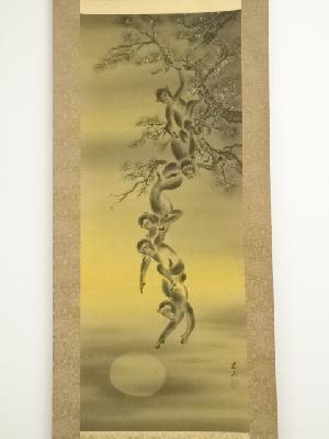 北川恵山筆 月と五猿 肉筆絹本掛軸(共箱)