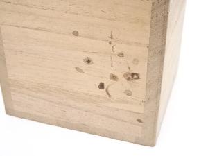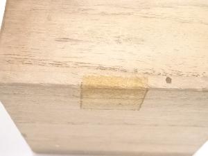 木箱にシミとテープ跡があります。