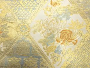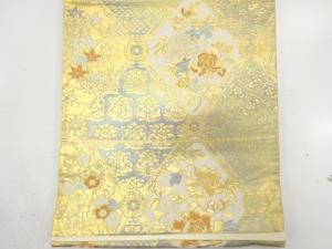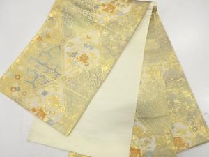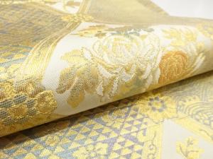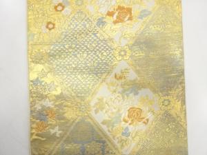 JAPANESE KIMONO / ANTIQUE FUKURO OBI / SILK / WOVEN GRID & ROUGH WAVE & TRIANGLES & FLOWERS