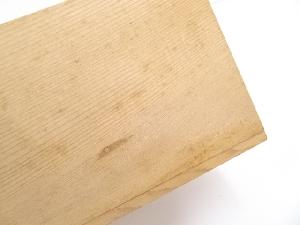 木箱の桟に少し浮き、側面にシミとシールの付着があります。