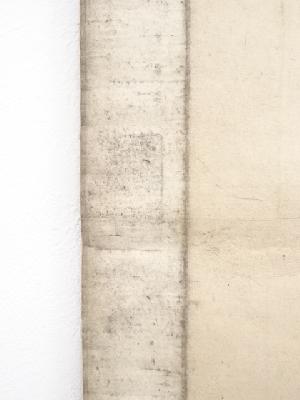 また、表具上部に若干破れと、表具裏面に書き込みがあり、軸先の片方に紙が付着しています。