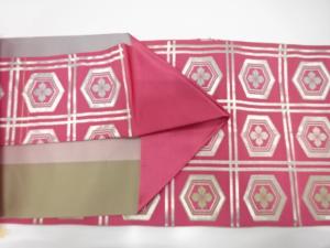 • アンティーク 本場筑前博多 格子に花亀甲模様織り出し名古屋帯(着用可)