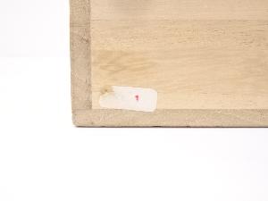 木箱の側面にテープが付着しています。