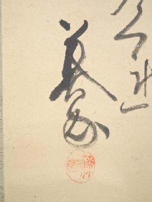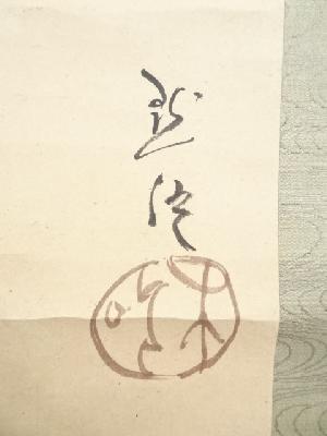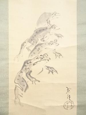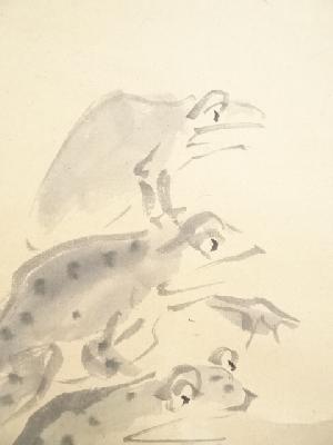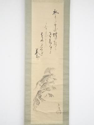 浅井忠筆 蛙図・池辺義象賛 肉筆紙本掛軸(保護箱)