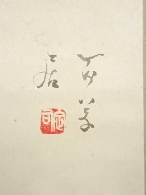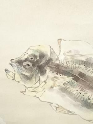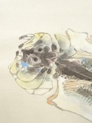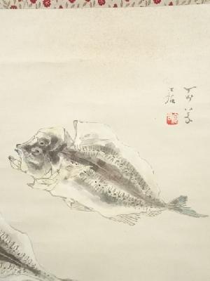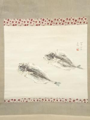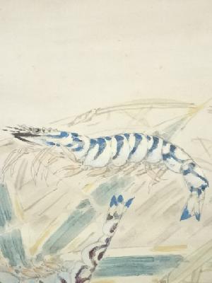 岸浪百草居筆 鯵干魚・車海老双幅 肉筆紙本掛軸(共箱)