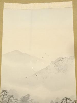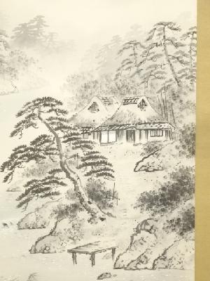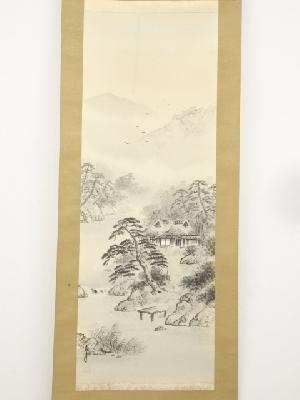 岡本友年筆 水墨山水 肉筆絹本掛軸(共箱)