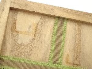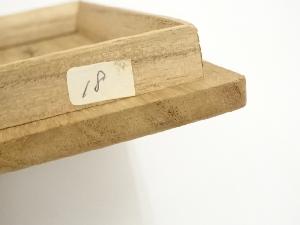 木箱の蓋の桟にシールが付着、底部にテープ跡、また虫食いがあります。