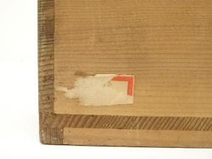 木箱の蓋に焼けとシミ、身にシール跡があり、紐が外れています。