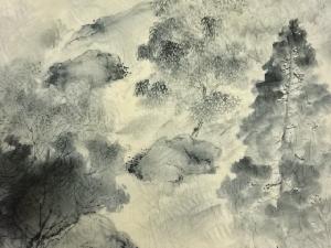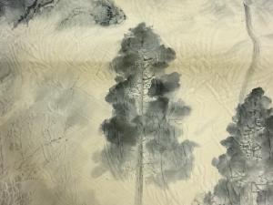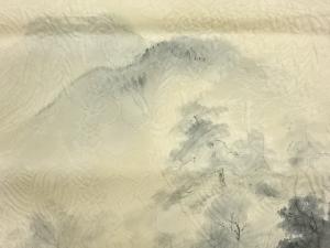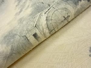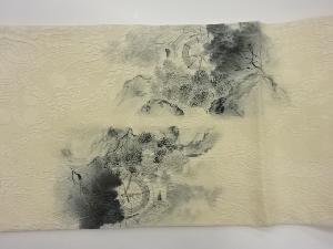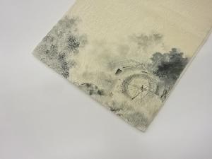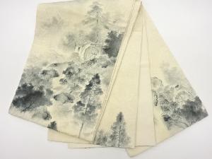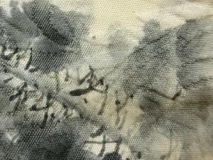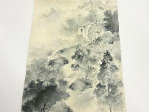 纐纈 手描き 山に水車小屋・樹木模様袋帯