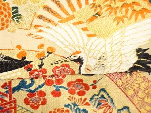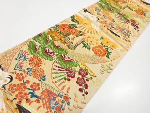 アンティーク 扇面に御所車・鶴・草花模様織り出し丸帯(着用可)