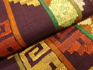 じゅらく製 手織り紬縞に幾何学模様織出し名古屋帯