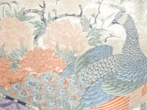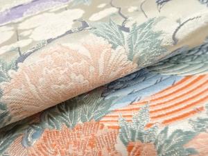 屏風に牡丹・孔雀・藤模様織り出し 袋帯